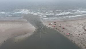 A força das águas durante a abertura natural do canal da Barra de Ibiraquera, em Imbituba, arrastou um quiosque localizado na área na última terça-feira (30). O fenômeno, comum na região, não causou vítimas, mas evidenciou a potência da correnteza.