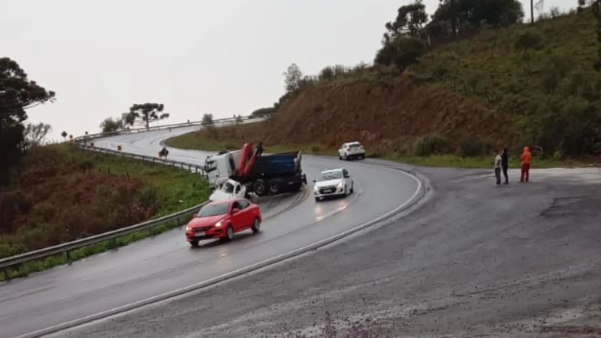 Acidente grave entre caminhão e carro mobiliza socorristas na SC-114, em São Joaquim