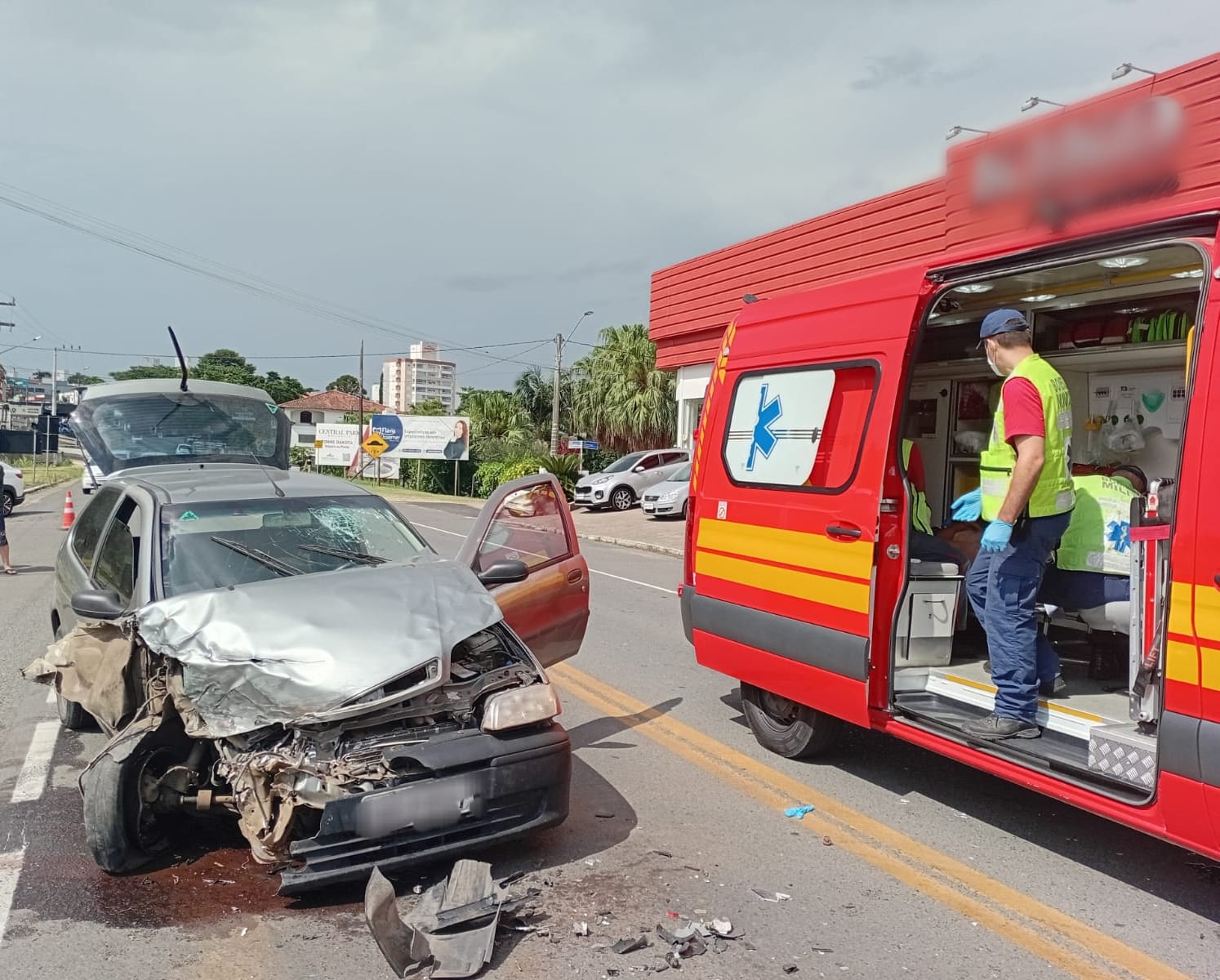 O motorista do carro foi encontrado inconsciente fora do veículo, com sinais vitais alterados. Ele apresentava um corte profundo na perna direita, um ferimento na cabeça causado pelo impacto no para-brisa, além de sudorese intensa e saliva espumosa.