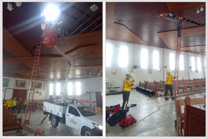 O resgate contou com o apoio da empresa Cergal, que disponibilizou uma caminhonete com cesto elevatório, posicionada no interior da igreja. Após a amarração do forro para evitar o colapso total da estrutura, a vítima foi retirada com segurança no cesto, com auxílio do sistema de descida controlada montado pelos bombeiros.