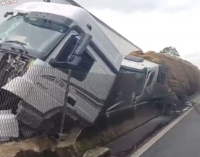 Um caminhão carregado com aproximadamente 19 toneladas de melancias tombou na manhã desta quarta-feira (21) após um acidente envolvendo quatro veículos na BR-101, em Garuva, no Norte de Santa Catarina.
