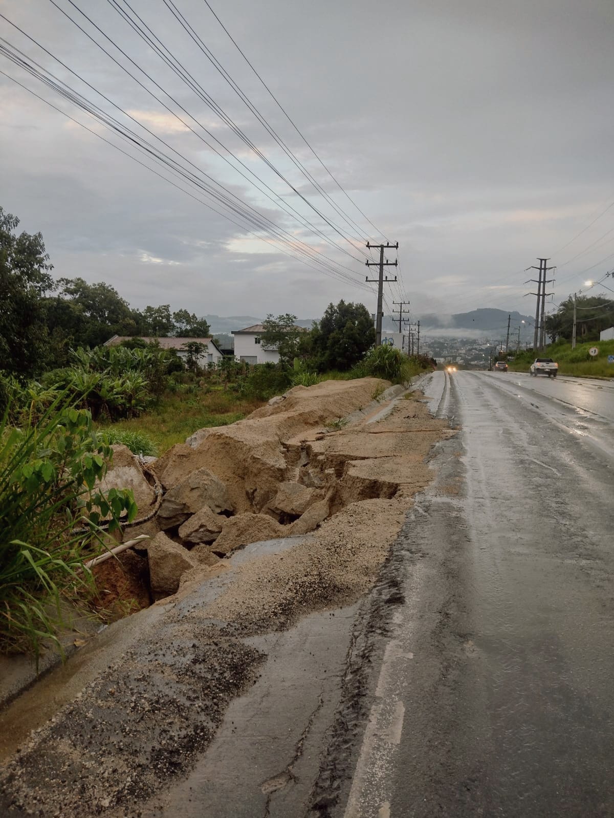 Parte do acostamento da Rodovia SC-108 cedeu neste domingo (15) após as fortes chuvas que atingem a região. O desmoronamento ocorreu no bairro Corridas, em Orleans, no sentido Orleans–Urussanga, próximo à empresa Erasmo Brindes, ponto de referência na localidade.