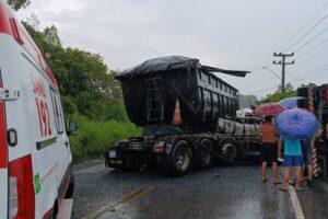 Um acidente envolvendo duas carretas interditou a rodovia SC-443, no bairro Linha Anta, em Içara, na tarde deste sábado (17). A colisão, ocorrida por volta das 14h40, mobilizou equipes do Corpo de Bombeiros e do SAMU para atender três pessoas feridas.