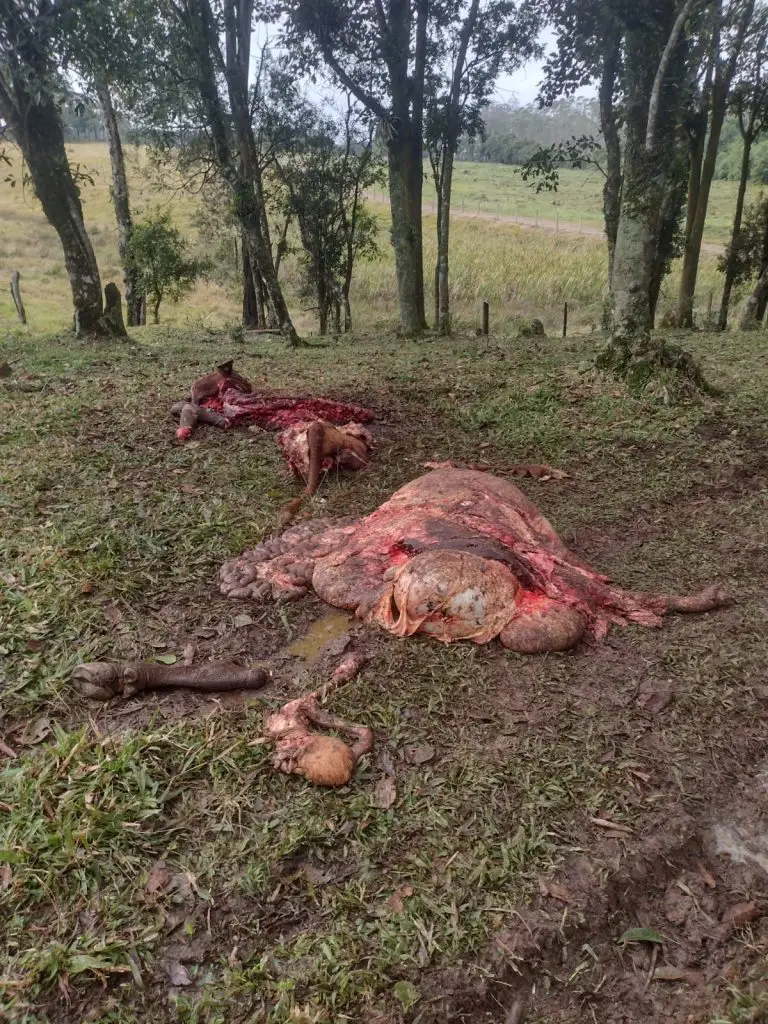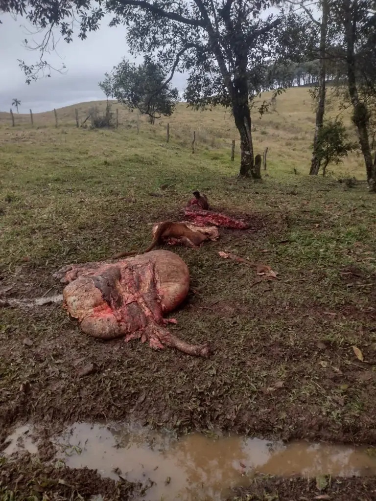 De acordo com o relato da vítima, na manhã desta segunda-feira (30), ao chegar ao pasto, foi encontrada uma cena alarmante: um touro de raça havia sido abatido durante a madrugada. A carne e o couro foram levados, enquanto os restos do animal estavam espalhados pela área. Ainda segundo o morador, no ano anterior, quatro animais já haviam sido furtados da mesma propriedade. Nesta nova ação, além do touro abatido, os criminosos deixaram três vacas presas na mangueira.