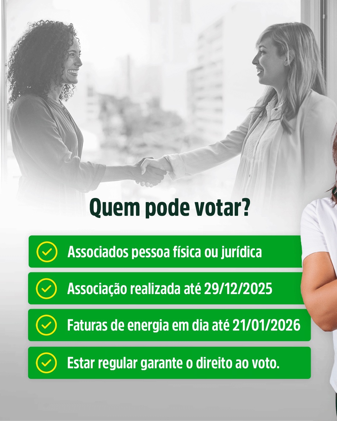 O voto é facultado a associados pessoa física ou jurídica que tenham feito a adesão até 29 de dezembro de 2025. É condição obrigatória estar com as obrigações financeiras (faturas de energia) em dia até 21 de janeiro deste ano. A cooperativa ressalta que não é permitido o voto por procuração, exigindo a presença pessoal do cooperado ou de seu representante legal.