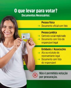 Para votar, é preciso apresentar documentação específica. Pessoas físicas devem levar documento oficial de identidade com foto. Pessoas jurídicas precisam apresentar o contrato social registrado e o documento com foto do responsável legal. Entidades ou associações devem portar a ata ou estatuto que designe o representante legal, além do seu documento de identidade com foto.