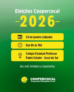 A Cooperativa de Eletrificação Rural de Cocal do Sul (Coopercocal) realiza suas eleições neste sábado, 24 de janeiro de 2026. Os associados votarão para escolher os membros do Conselho de Administração, do Conselho Fiscal e os Delegados Representantes junto à Federação das Cooperativas do Estado de Santa Catarina (Fecoerusc). O pleito acontece das 8h às 16h, na Escola Estadual Professor Padre Schuler, no centro da cidade.