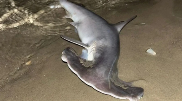 Um filhote de tubarão-martelo (Sphyrna sp.) foi capturado na noite da última quinta-feira, 25 de dezembro, no Balneário Rincão, em Santa Catarina. O animal, de pequeno porte, ficou preso em uma rede de pesca, mas foi prontamente liberado pelos pescadores, conforme orientações para espécies ameaçadas.