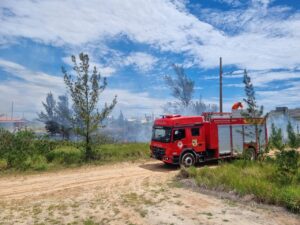 Fogo em terreno baldio no bairro Dunas do Sul foi controlado por bombeiros voluntários; moradores apontam queda de artefato como causa.
