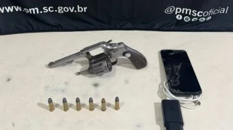 Foto: Divulgação/PMSCUm homem de 34 anos foi detido por porte ilegal de arma de fogo na noite de domingo (25), por volta das 20h20, às margens da BR-101, no km 464, no bairro Sanga da Madeira, em Passo de Torres. A Polícia Militar apreendeu um revólver calibre 32 e seis munições.