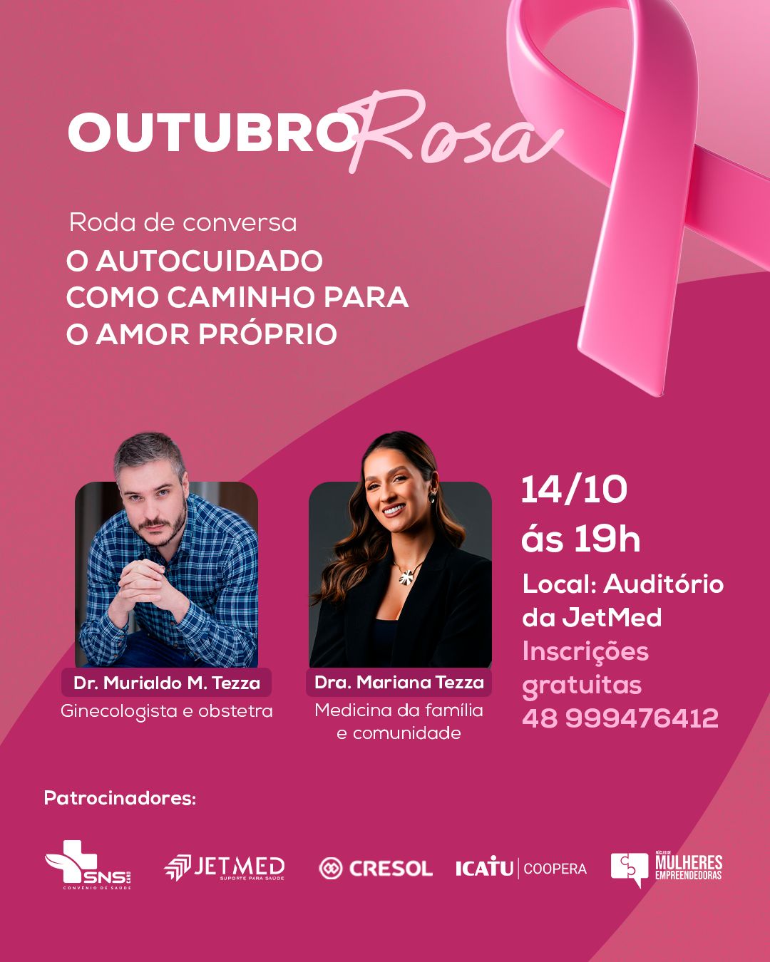 Na próxima terça-feira, 14 de outubro, a JetMed será o palco de uma ação especial dentro da campanha Outubro Rosa em Orleans. A partir das 19h, o auditório da clínica sediará a roda de conversa “O Autocuidado como Caminho para o Amor Próprio”. O objetivo é ir além da conscientização sobre o câncer de mama e promover uma reflexão sobre a saúde física e emocional das mulheres, incentivando práticas de bem-estar.