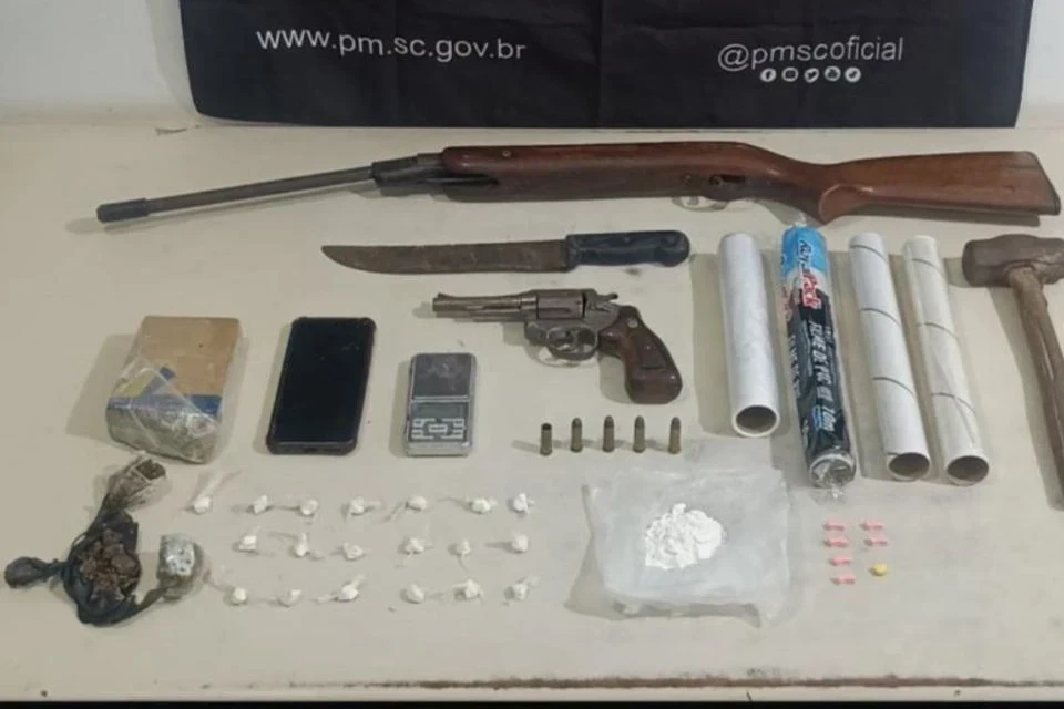 Durante a revista, os militares encontraram uma porção de maconha, e o rapaz admitiu possuir mais drogas em casa. No imóvel, foram apreendidos um revólver Taurus calibre 38, com quatro munições intactas e uma deflagrada, além de uma carabina de pressão, 411 gramas de maconha, 43 gramas de cocaína, seis comprimidos de ecstasy e materiais utilizados para preparar entorpecentes.