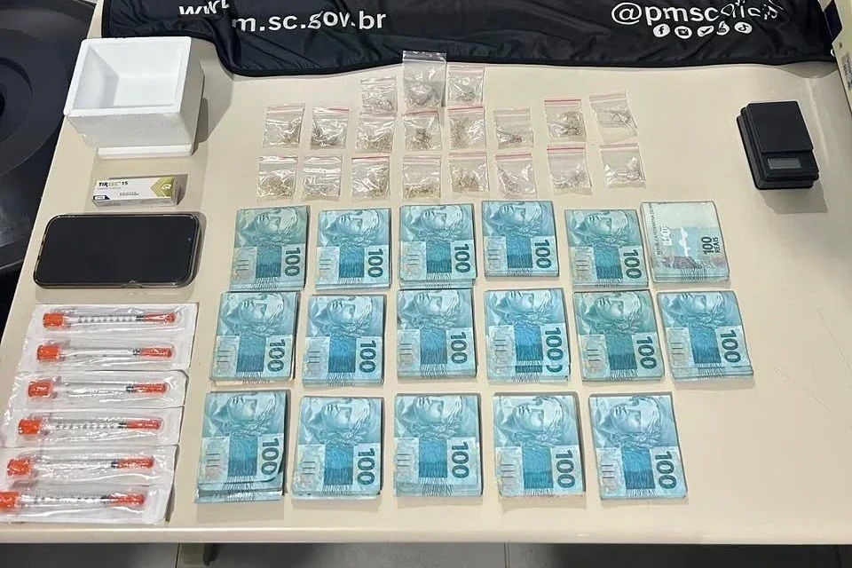 De acordo com a Polícia Militar de Santa Catarina, a ocorrência teve início após denúncias de que o suspeito estaria comercializando drogas no estacionamento de um estabelecimento. Ao perceber a presença policial, ele tentou fugir e descartou uma sacola com substâncias ilícitas, seringas e os medicamentos, mas acabou sendo abordado.