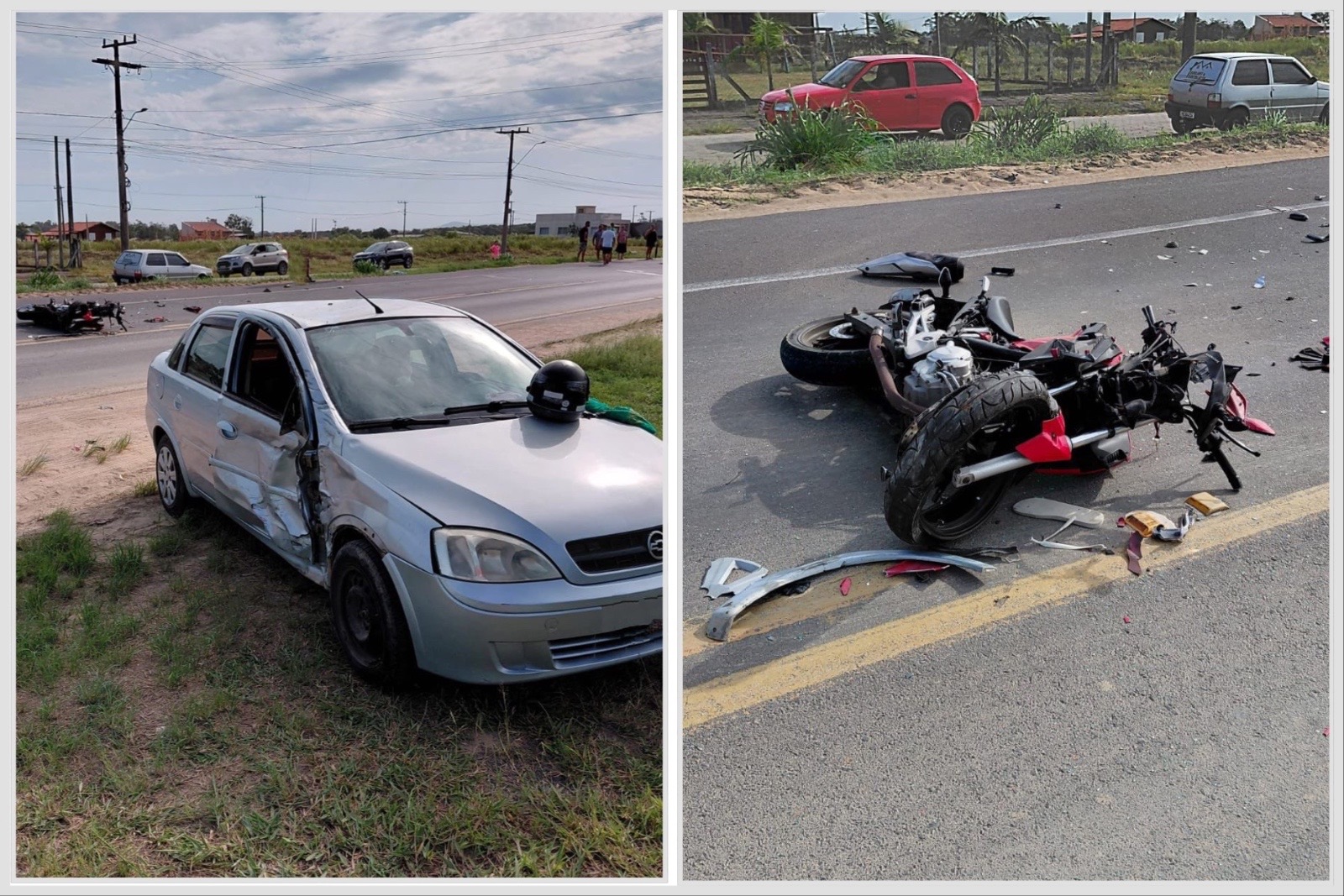 Um motociclista de 40 anos morreu na tarde desta terça-feira (17) após um grave acidente na Rodovia Claudino Abel Botega, no bairro Laranjal, em Jaguaruna, no Sul catarinense. A colisão envolveu uma Honda Twister e um Chevrolet Corsa.