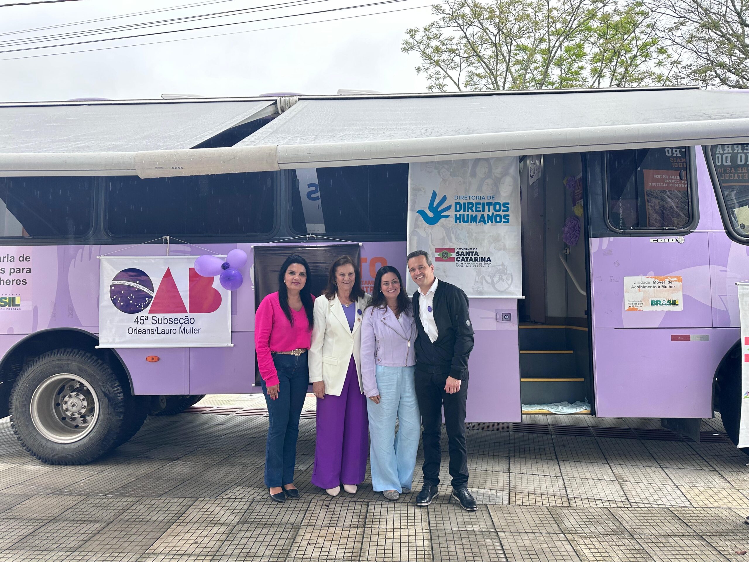 A cidade de Orleans recebeu, nesta segunda-feira (22), a ação do Ônibus Lilás, um projeto itinerante que leva conscientização e enfrentamento à violência contra a mulher. A unidade móvel ficou estacionada no município prestando atendimento gratuito e sigiloso, com escuta qualificada, distribuição de informativos e orientações sobre os direitos das mulheres e os canais de denúncia.