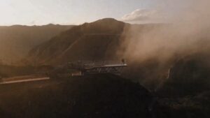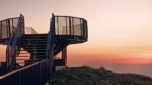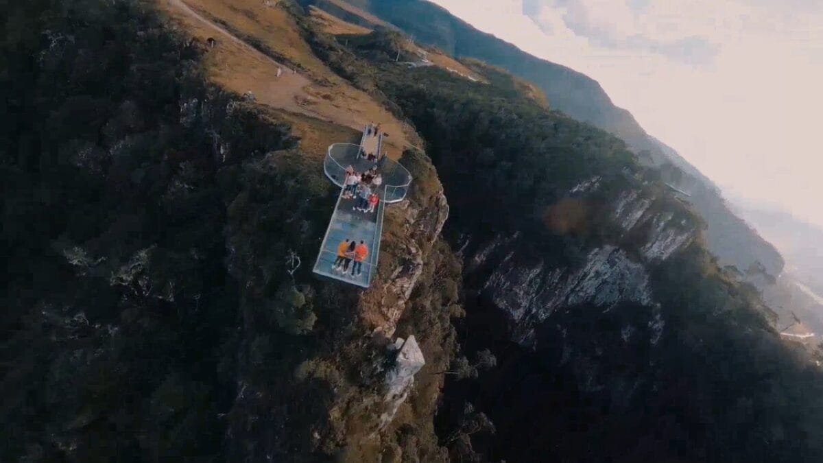 Estrutura suspensa no parque Altos do Corvo Branco oferece vista panorâmica e desafia visitantes a caminhar sobre o vazio