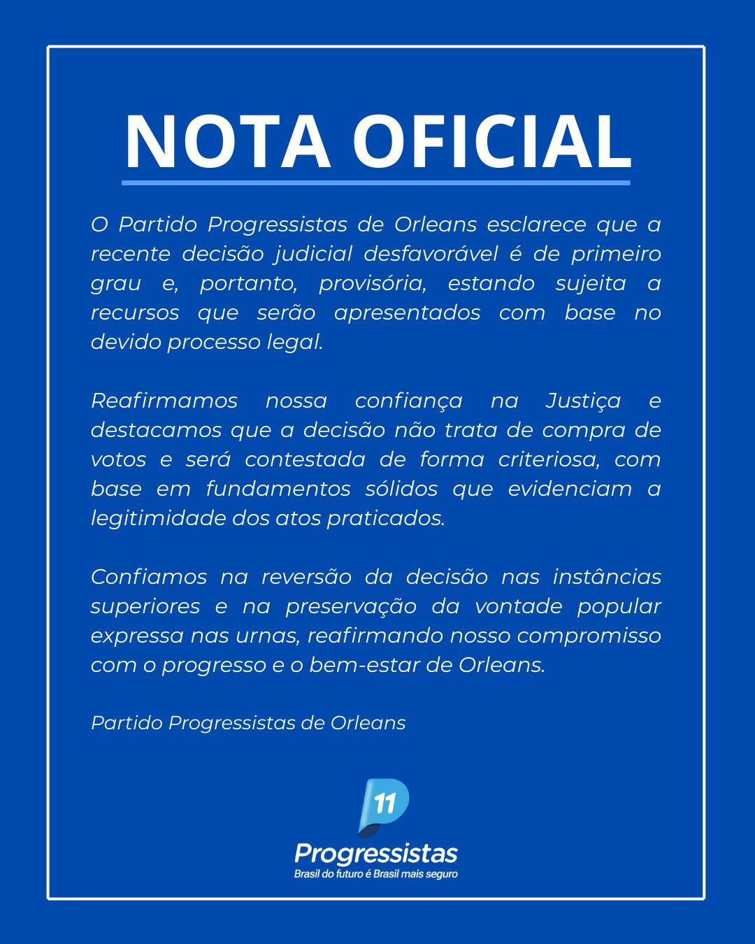 O Partido Progressistas de Orleans divulgou uma nota oficial após a repercussão, nas redes sociais, de uma decisão judicial desfavorável à sigla. No comunicado, o partido esclarece que a sentença é de primeiro grau e, portanto, provisória, estando sujeita a recursos dentro do devido processo legal.