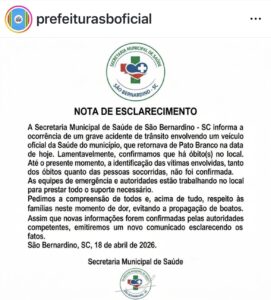Um grave acidente na tarde deste sábado (18) na rodovia PR-158, divisa entre Vitorino (PR) e São Lourenço do Oeste (SC), vitimou quatro ocupantes de um veículo da Secretaria Municipal de Saúde de São Bernardino. O carro transportava pacientes que haviam realizado procedimentos médicos em Pato Branco (PR). Duas pessoas foram socorridas em estado grave.