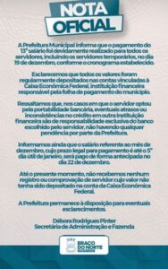 Em resposta às reclamações, a Prefeitura de Braço do Norte emitiu nota no domingo (21) garantindo que todos os pagamentos, inclusive aos temporários, foram realizados no dia 19, em conta na Caixa. A nota ressalta que atrasos no crédito em casos de portabilidade para outros bancos são de responsabilidade do sistema financeiro, não da administração municipal.