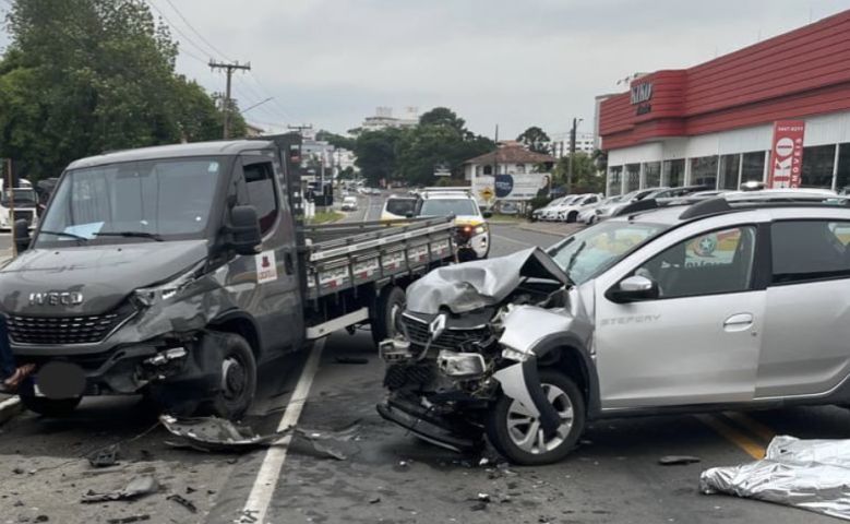 Um homem de 50 anos morreu e sua mãe, de 70, ficou ferida após uma violenta colisão frontal entre o carro que eles ocupavam e um caminhão. O acidente ocorreu na tarde desta segunda-feira (8), na SC-108, no Centro de Cocal do Sul, próximo a estabelecimentos comerciais.