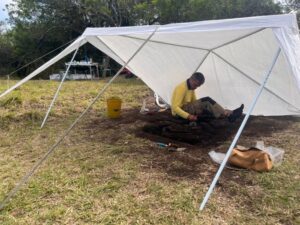 Estudos anteriores revelam que o local, um dos sambaquis mais estudados do Brasil, funcionou como um cemitério monumental por mais de mil anos, com estimativas de até 43 mil indivíduos sepultados entre 3200 e 1500 anos antes do presente. A escavação emprega um protocolo minucioso: o sedimento é escavado por “fácies arqueológicas” – camadas definidas por composição e cor –, e todo material coletado passa por curadoria, incluindo pesagem, limpeza e secagem para análise futura.