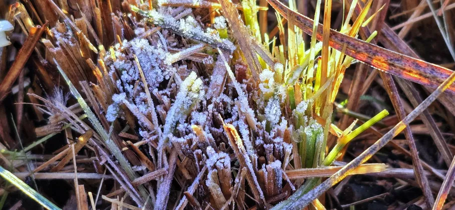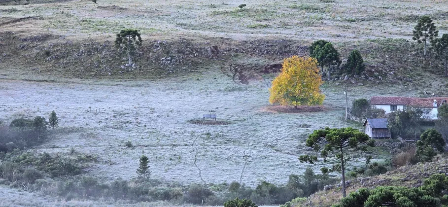Nesta segunda-feira (29), o Vale Caminhos da Neve, situado a apenas 3 km do centro de São Joaquim, foi coberto por uma fina camada de geada. A temperatura mínima registrada foi de -1,9ºC, de acordo com a estação meteorológica da Epagri/Ciram.